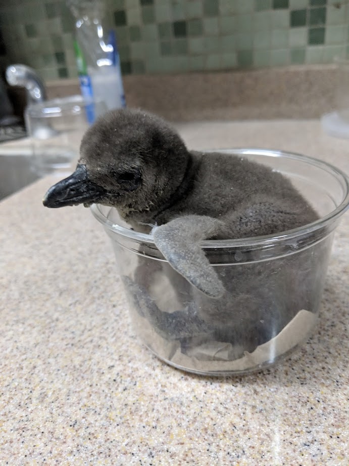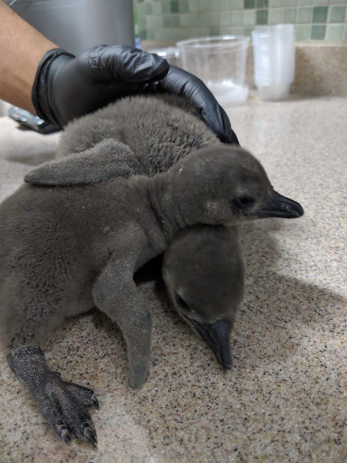 Newly hatched African penguins fledge for about 90 days and have an inborn fear of water. While they are in their soft fluffy down feather coat, they have no protection from the elements and cold water can give them hypothermia. As the chicks grow, they start to lose their baby fuzz and get their adult plumage in. They can learn to swim once they develop their waterproof coat.